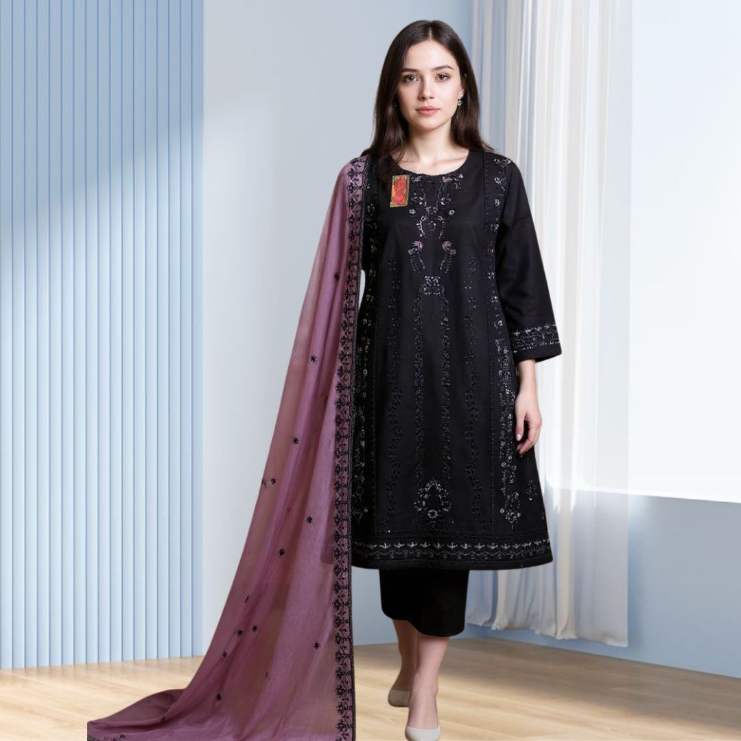 This elegant stitched 3-piece suit features delicate embroidery on soft cotton fabric, paired with a flowy chiffon dupatta. A perfect choice for effortless everyday style with a touch of sophistication.