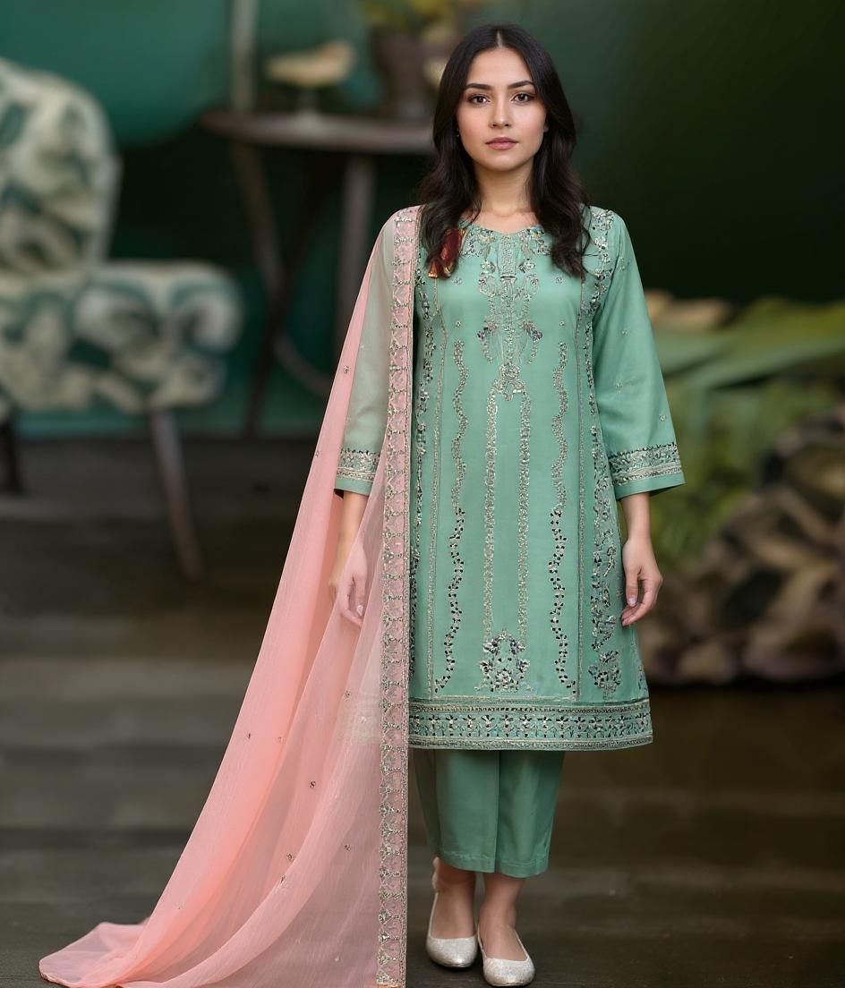 Elegant and ready to wear — this stitched 3-piece suit features a soft cotton embroidered shirt, matching trouser, and a flowy chiffon dupatta. The rich with delicate embroidery makes it ideal for casual and semi-formal occasions. A timeless outfit for everyday grace.