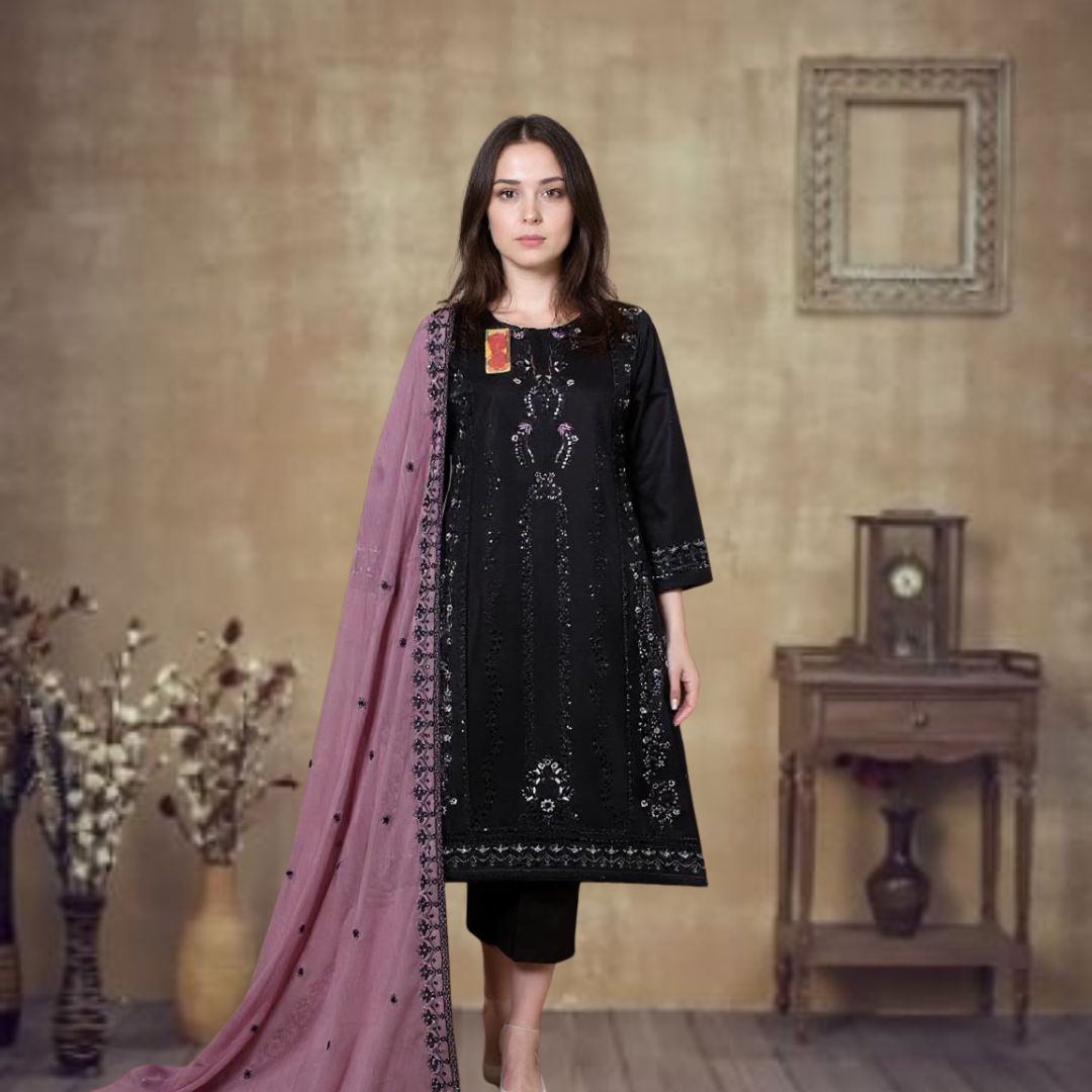 Experience the perfect blend of comfort and style in this stitched cotton suit paired with a light, graceful chiffon dupatta.