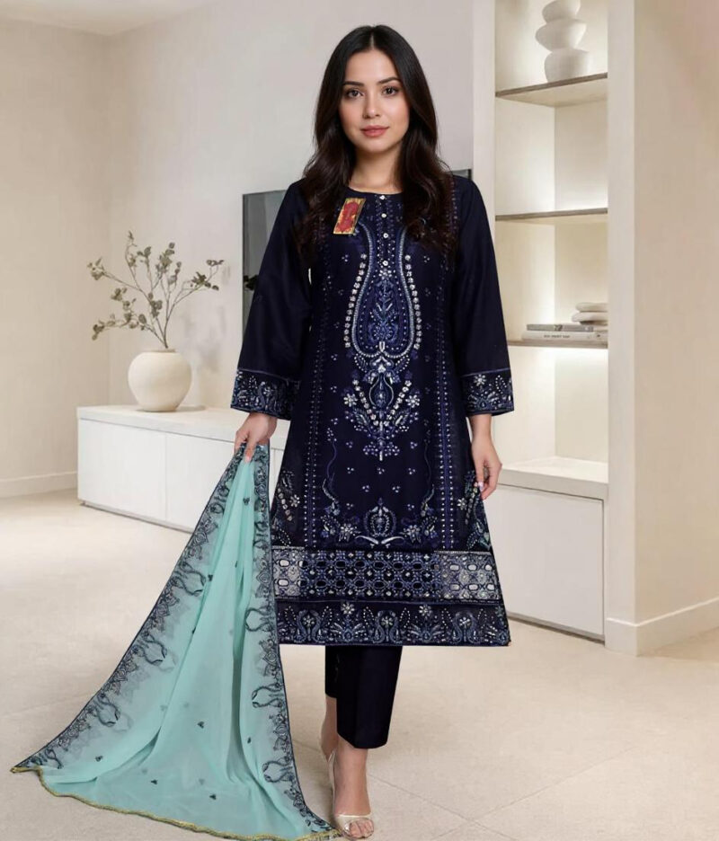 Elegant stitched 3-piece cotton suit with delicate embroidery and a flowy chiffon dupatta – perfect for daily and semi-formal wear.