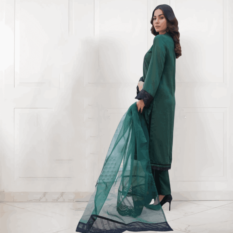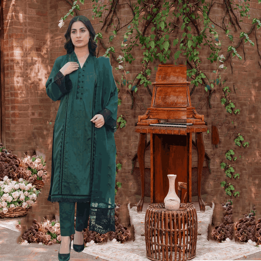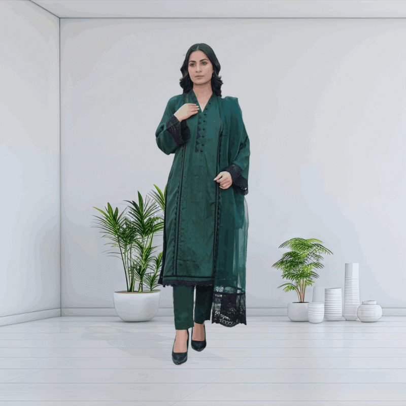 Experience effortless elegance with this stitched 3-piece suit from the Threads & Weaves Pret Emb Viscose Collection. Crafted in a soft pasta hue, this outfit features a beautifully embroidered shirt and sleeves, paired with a sleek cigarette trouser. The embroidered organza dupatta adds a luxurious finish, making it a perfect choice for festive gatherings or formal occasions.